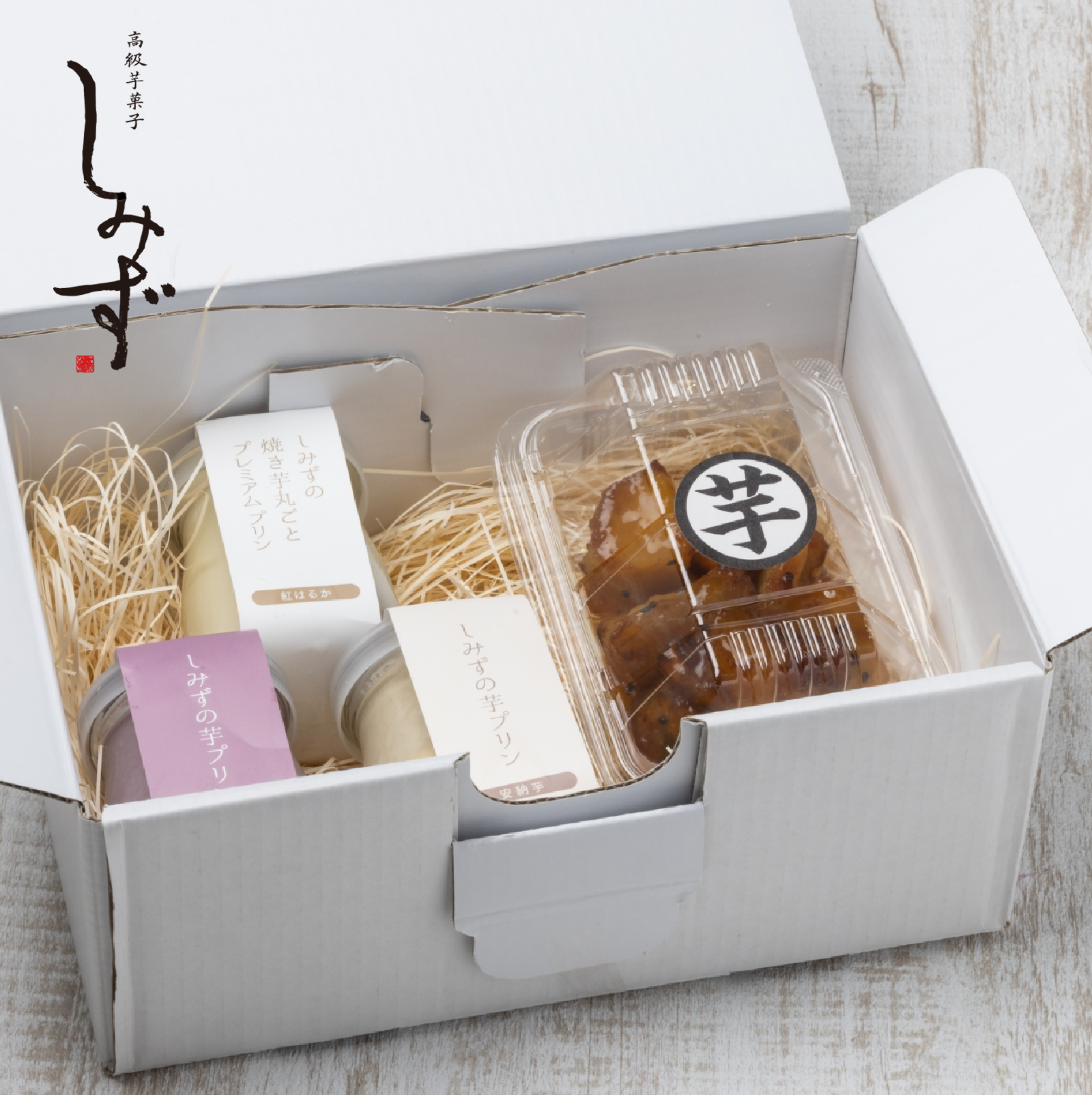 | 商品内容/内容量 | しみずバラエティーセットDセット/大学芋【小】 1個・安納芋プリン 1個・紫芋プリン 1個・焼き芋丸ごとプレミアムプリン1個 |